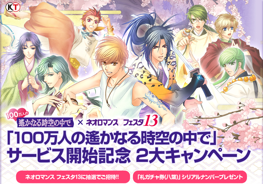 「ネオロマンス・フェスタ13」に来場された皆様に、 もれなく「100万人の遙かなる時空の中で」で使える「札ガチャ券(八葉)」が 入手できるシリアルナンバーをプレゼントします。 戦闘で使用する「八葉」の札がランダムで入手できるガチャ券です。