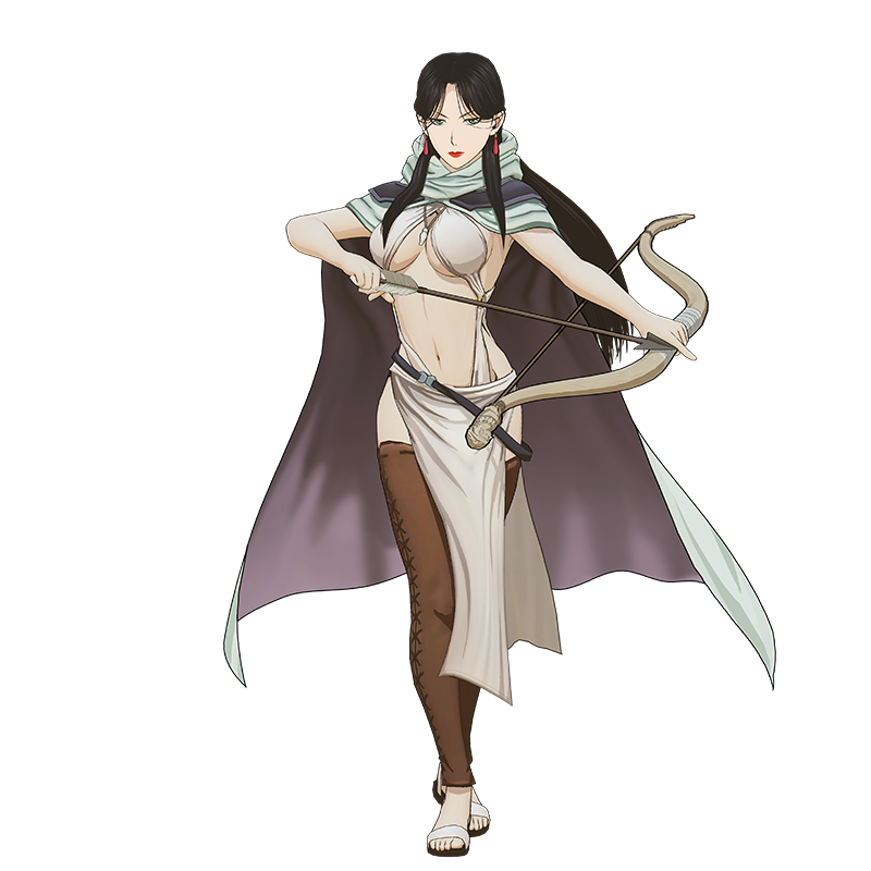 アルスラーン誕生にあわせて寄進された、ミスラ神殿に勤めるが、アトロパテネの戦いに際して、アルスラーンを守護するため神殿から派遣される。その姿は、女性関係が豊富なギーヴをひと目惚れさせるほど優美。また、見事な弓の腕前を披露するほか、水晶の笛の力で精霊たちを自在に使いこなす。