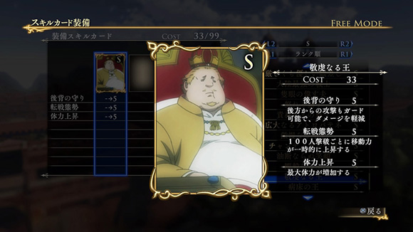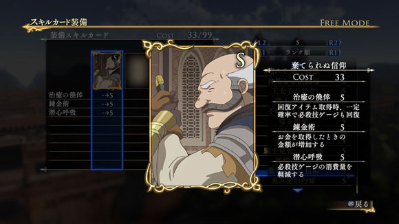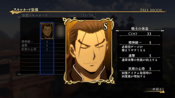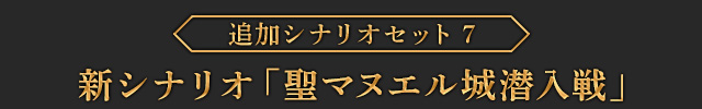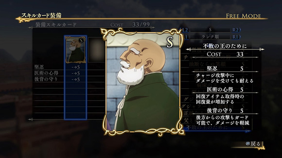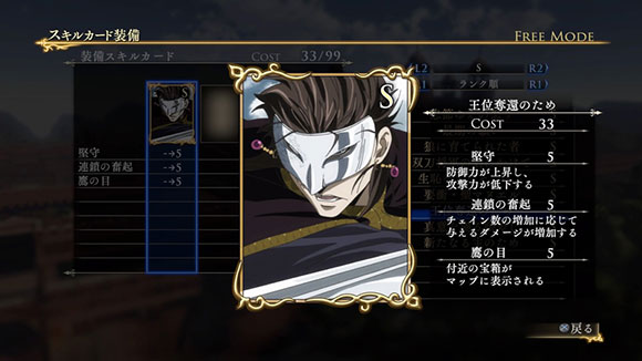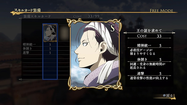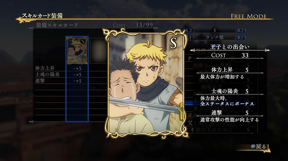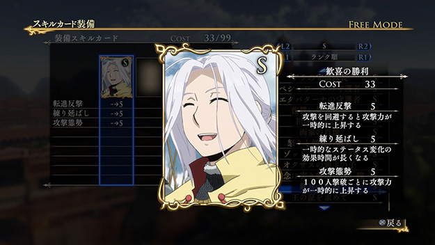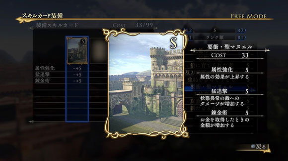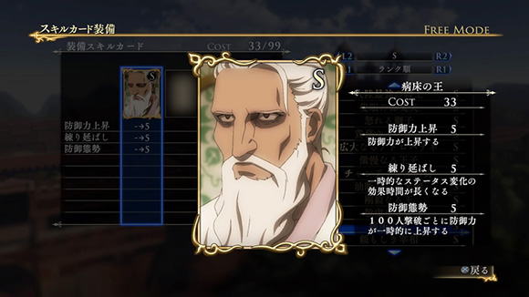 このシナリオをクリアすると、製品版では入手できないヒルメスの新武器「支配者の剣」が獲得できます。さらに特定の条件を満たすと、限定スキルカード「一国に冠絶する剣技」が入手できます。| ※ | 「FREE MODE」の「DLC2」に「聖マヌエル城防衛戦」が追加されます。また、シナリオをプレイすると、ヒルメスの新武器「支配者の剣」が手に入り、クリアするといつでも装備可能になります。 |