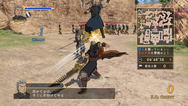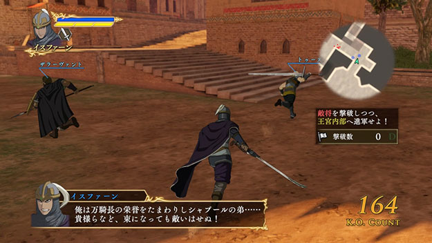 イスファーンが主役の新シナリオです。王都内における模擬戦で、ザラーヴァントやトゥースとともにパルスが誇る武人たちを何人討ち取れるか、武功を争うというゲームオリジナルのシナリオとなります。このシナリオをクリアすると、製品版では入手できないイスファーンの新武器「蒼き狼の裂剣」が獲得できます。| ※ | 「FREE MODE」の「DLC2」に「競争共闘戦」が追加されます。また、シナリオをプレイすると、イスファーンの武器「蒼き狼の裂剣」が手に入り、クリアするといつでも装備可能になります。 |