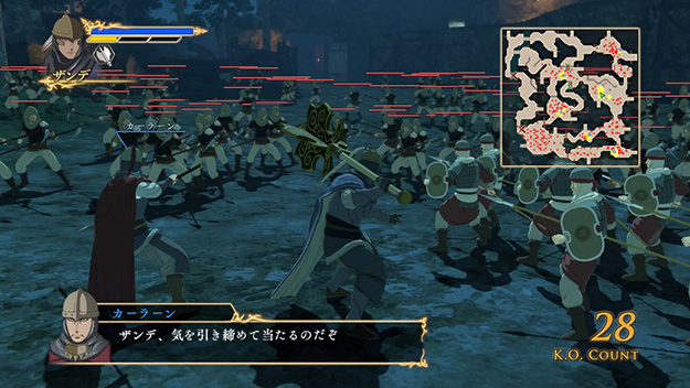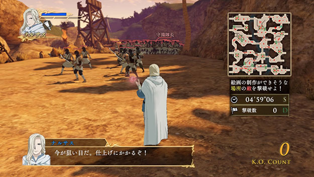 ナルサスが主役の新シナリオです。ナルサスが絵画を描くために、人払いをするところから物語は始まります。また、ナルサスが落ち着いて絵画を描けるようエラムも参戦し、敬愛する主人を守ります。このシナリオをクリアすると、製品版では入手できないナルサスの新武器「奇跡の杖」が獲得できます。| ※ | 「FREE MODE」の「DLC2」に「絵画防衛戦」が追加されます。また、シナリオをプレイすると、ナルサスの武器「奇跡の杖」が手に入り、クリアするといつでも装備可能になります。 |