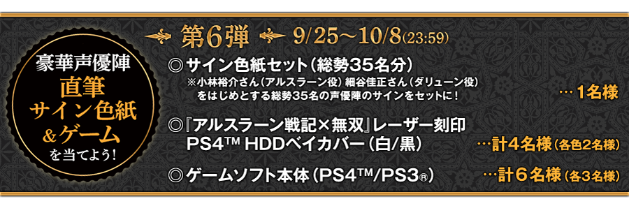 クイズに正解した方の中から抽選でゲーム『アルスラーン戦記×無双』の声優陣による直筆サイン色紙をプレゼント!