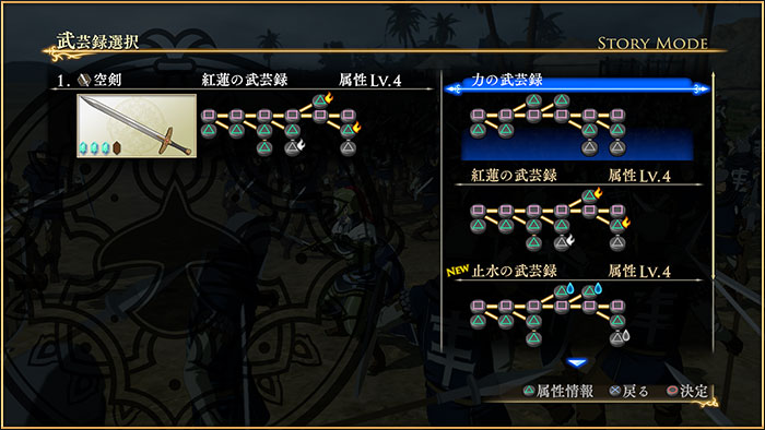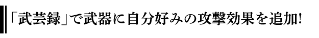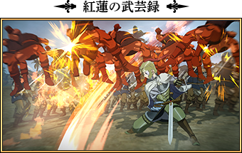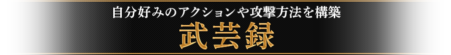 プレイアブルキャラクターは、それぞれ固有の武器を複数装備できますが、装備できる武器それぞれに対して、複数の「武芸録」が存在します。「武芸録」には、「力の武芸録」や「紅蓮の武芸録」などの種類が存在し、それぞれアクションフロー(コンボツリー)や攻撃効果が異なります。プレイヤーは、好みに合わせた「武芸録」をそれぞれの武器で使用することで、自由に攻撃方法を構築できます。