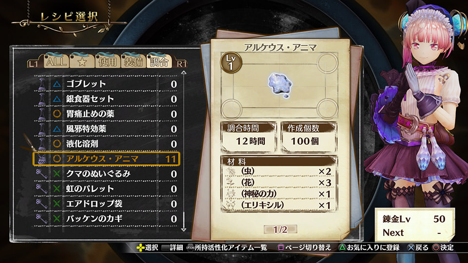 「バトルミックス」で使用するバトルレシピの追加に加え、アルケウス・アニマの所持数上限を解放、さらにアルケウス・アニマを調合で作成できるレシピが手に入ります!