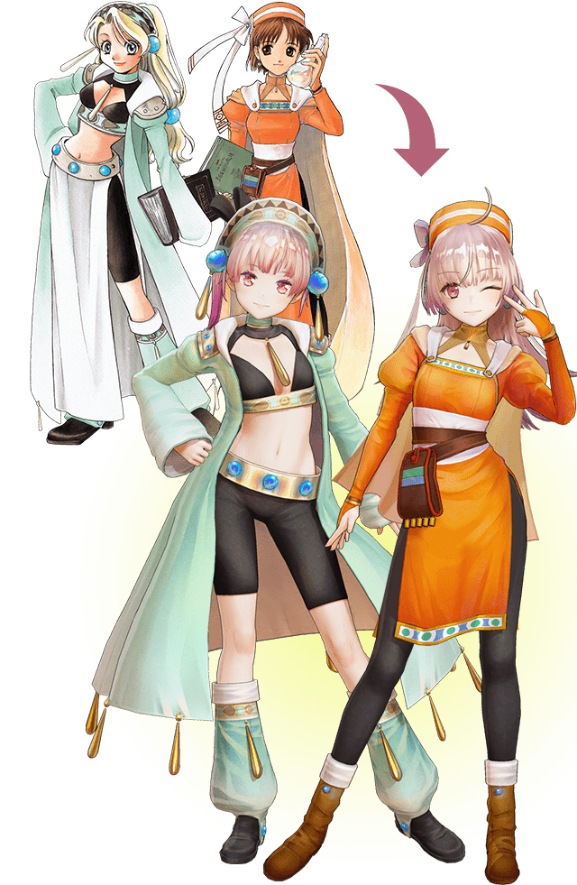 リディーが「アトリエ」シリーズ第1作目『マリーのアトリエ ~ザールブルグの錬金術士~』の主人公マリーに、スールが「アトリエ」シリーズ第2作目『エリーのアトリエ ~ザールブルグの錬金術士2~』の主人公エリーになりきるコスチューム! これを着れば、リディーとスールもザールブルグの錬金術士に!