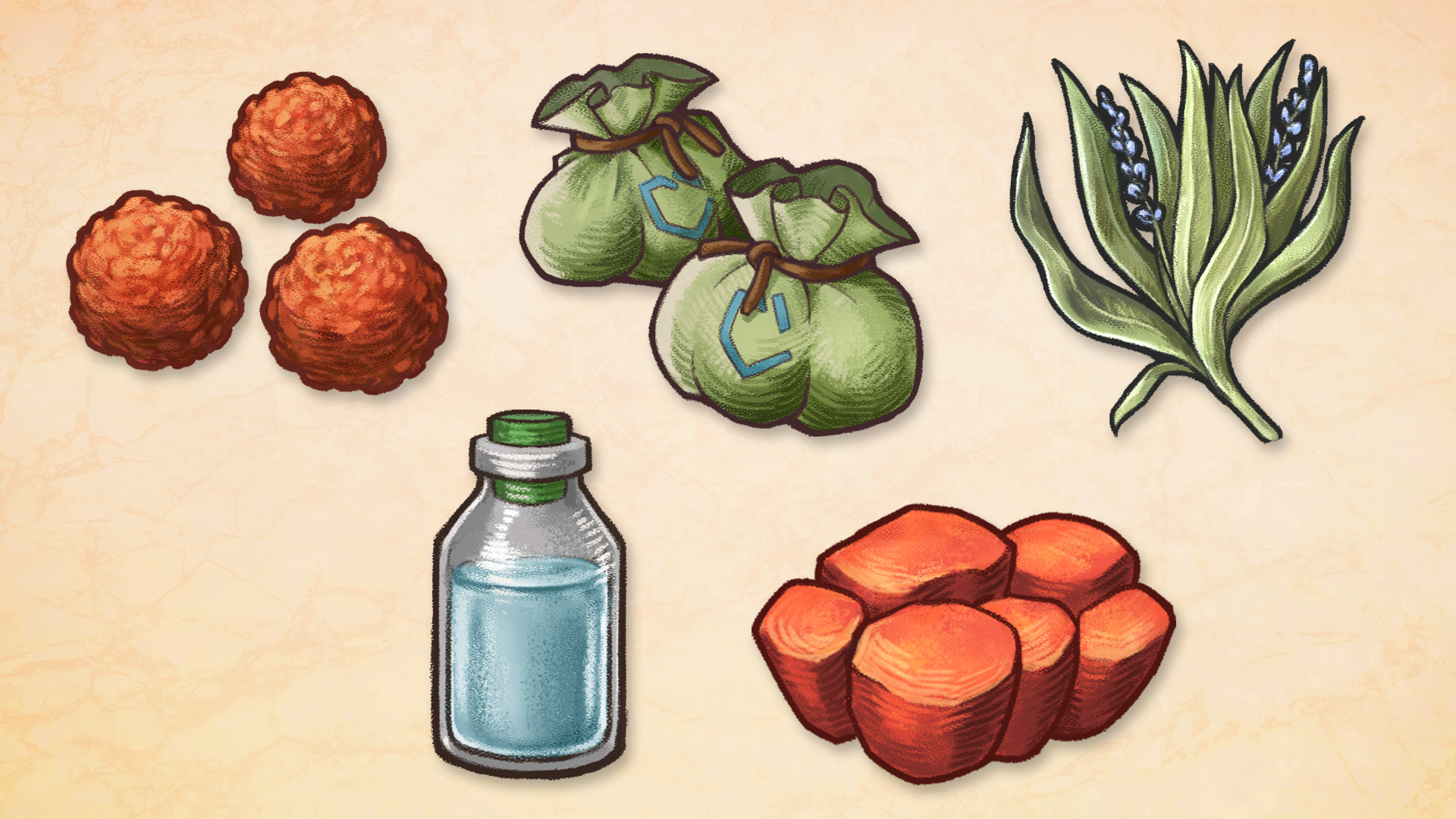 ・フラム × 10 ・クラフト × 10 ・魔法の草 × 20 ・へーベル湖の水 × 20 ・カノーネ岩 × 20