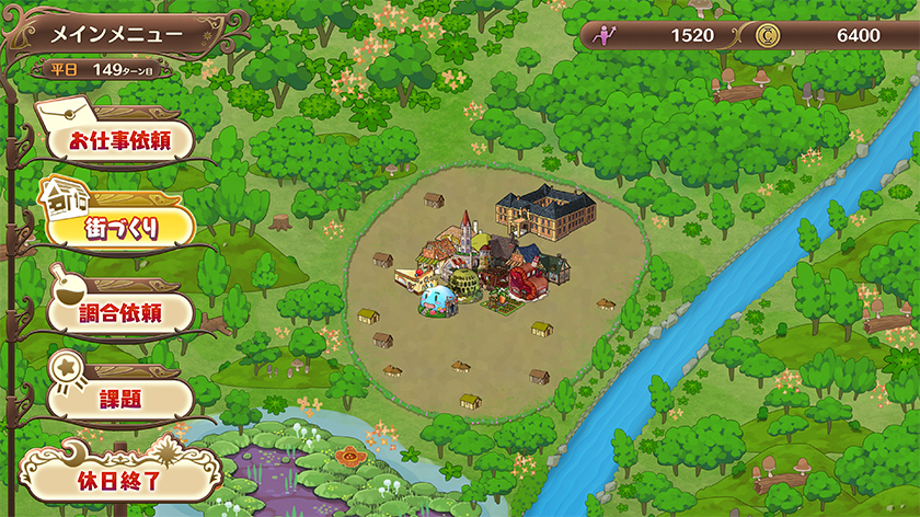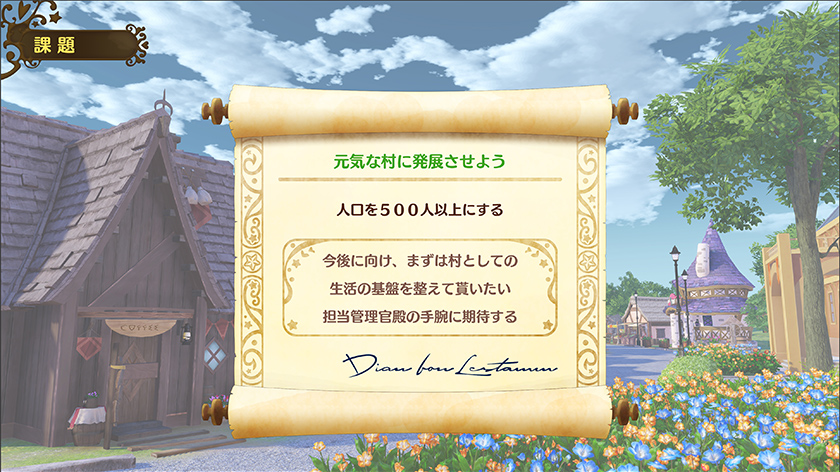 赴任したてのヴェストバルトは、のどかな田舎の村です。そこにネルケは小さなお店を開きます。まずはこのお店を経営して収入を上げ、それを元手に村に施設を建てていきます。施設が整備されて村が発展していくにつれ、住民が増え、街の規模が拡大し、収入が増えます。