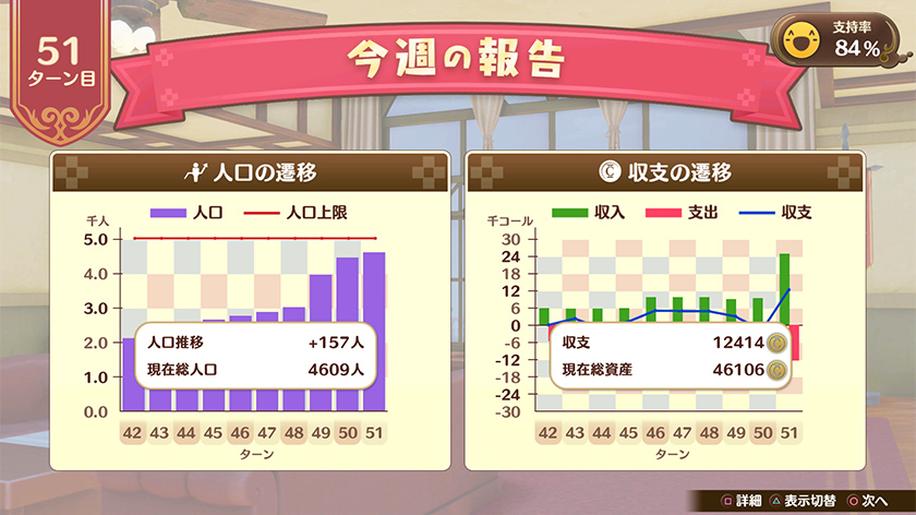 収入と投資のサイクルを順調に回すためには各種レポートを活用。人口遷移と収支遷移でバランスを見ます。