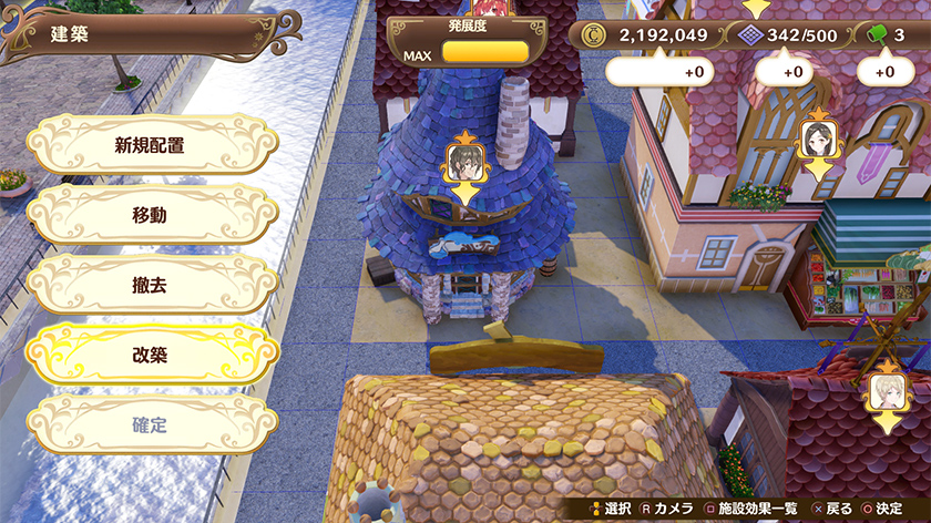 街の発展が進むと、建てられる施設の種類も増え、施設のグレードアップもできるようになります。グレードが上がった施設は見た目が変わるだけでなく、施設から得られる効果が増大する、といったメリットもあります。