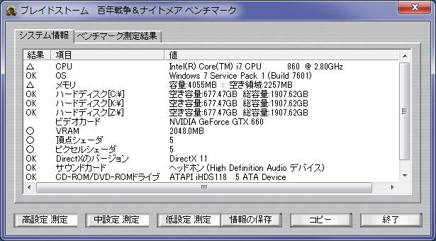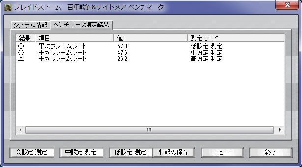 「中設定測定」「低設定測定」のボタンがいずれも選択できない場合は、Windows版『BLADESTORM 百年戦争&ナイトメア』の動作環境を満たしていないためです。