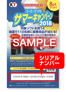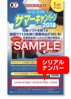 10pt獲得の対象となるゲームソフトをお求めいただいた場合、ゲームソフト分のポイントを獲得するためには、商品に同梱されている製品アンケート用シリアルナンバーをキャンペーン専用フォームにご入力いただく必要があります。シリアルナンバーの入力期限となる8月20日(月)までにお手元にお届けできるためには、8月8日(水)までにご予約・ご入金をお願いいたします。