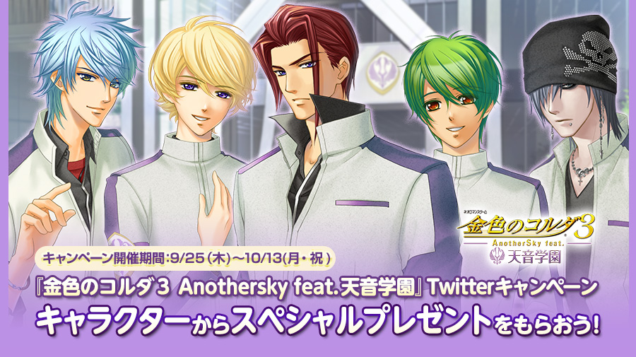 • 応募に当たっては、「Twitter」の利用規約を遵守した上で、つぶやいてください。また、つぶやきの際にはTwitterのプロフィールアイコンを本キャンペーンサイトに掲載の「金色のコルダ3 AnotherSky feat.天音学園」のキャラクターアイコンに変更してください。
