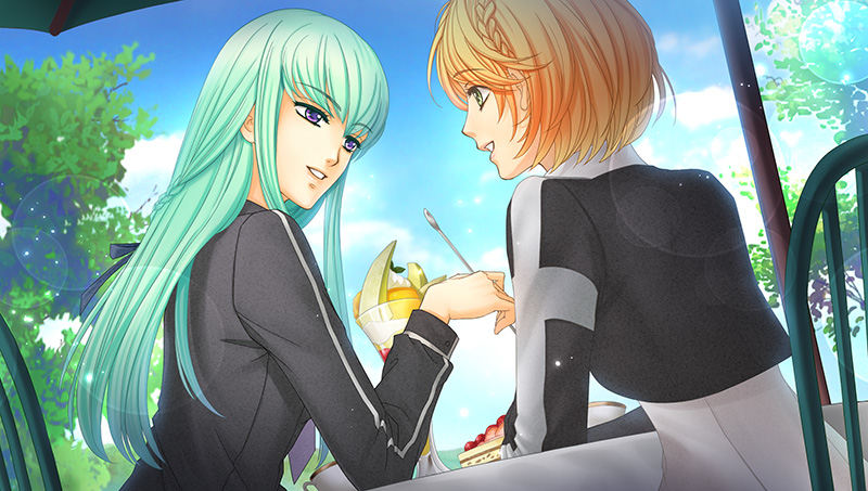 函館天音学園の女子生徒たちからカフェの新作スウィーツの情報を手に入れたニアはかなでを誘い、 ふたりはカフェへ行くことに。 ニア「待っていたぞ。あのカフェの新作スウィーツを食べに行くんだろう?」 「さぁ、行こうか。新作スウィーツが私たちを呼んでいる」 はやる気持ちに心なしか歩くスピードが速くなるふたり。 カフェに着きテラス席に案内されたニアとかなでは新作スウィーツを待ちながら、話に花を咲かせる。 店員「お待たせしましたー♥」 カフェの店員が、かなでとニアが注文した新作スウィーツをテーブルを置く。 ニア「なるほど、これが噂の。ふふ、ビジュアルはパーフェクトだ。さっそく食べようじゃないか」 「ああ、メロンとは実に数年ぶりの再会だ。果汁が口いっぱいに広がって…なんとも言えないな」 「このマンゴーも濃厚で…太陽の恵みとはまさにこのことだね。そっちのタルトの味はどうだい?」