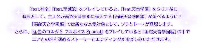 ※『feat.神南』、『feat.至誠館』はクリアしていなくても「函館天音学園編」をプレイできますが、ストーリーをお楽しみいただくためにも一度クリアしてからプレイすることをお勧めします。