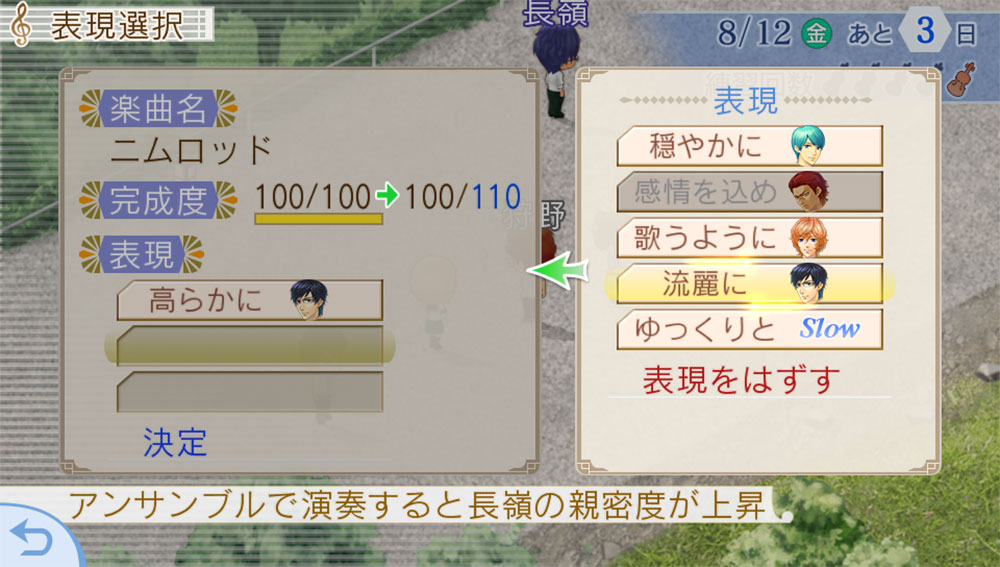 演奏を聞かせたり、イベント中の選択によっては相手との親密度が上昇することがあります。