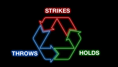 DEAD OR ALIVE のバトルは「打撃は投げに勝り、投げはホールドに勝り、ホールドは打撃に勝る」という3すくみの関係になっている。