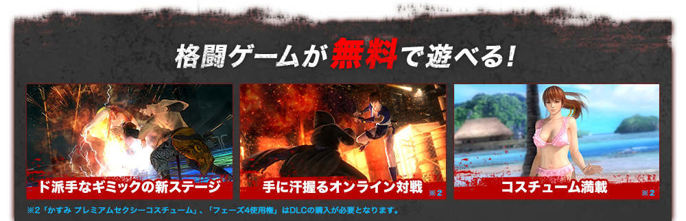 基本無料版/Core Fightersではご使用いただけません。 ストーリーモード開放権をご購入いただくことでご使用いただけます。 ※ストーリーは「DEAD OR ALIVE 5」(「DEAD OR ALIVE 5 Ultimate」)と同じ内容です。 |