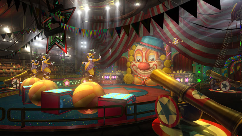 巨大なピエロの鼻にある射出口からザックが勢い良く射出されターゲットにヒット!賑やかなファンファーレとともに、ステージ周囲から紙吹雪が舞う。