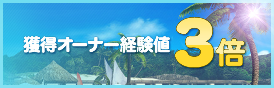 バカンス終了時に獲得できる経験値が3倍になるお得なキャンペーンを、9月21日(水)~10月5日(水)の 10月12日(水)期間限定で開催中! この機会にたくさんオーナーレベルをあげて、さまざまなVIP特典をGETしよう! ※バカンス終了時のオーナーリザルト画面で入手できる、経験値ボーナスが3倍になります。 ※期間終了後も、後日、再度開催する可能性がございます。