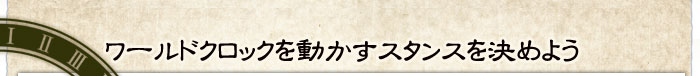 スタンスとは、時を“進める側になる”のか、“戻す側になる”のか、ということです。例えば、スタンスが“進める側”になった場合、航海者の取る行動は、時を未来に進める行動としてワールドクロックに蓄積されていきます。