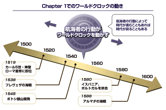 ワールドクロックは15〜18世紀の間を行き来しますが、Chapter 1「双頭の鷲」では、大航海時代が本格的に幕を開けた16世紀(1500年代)が舞台となります。