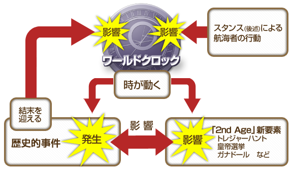 皆さんの行動により年代が動くと、それに合わせて歴史的事件が起こります。さらに「2nd Age」で加わる新要素にも影響を及ぼします。そこで皆さんがどのように行動し、歴史的事件がどのように推移するか。これらがワールドクロックに影響を及ぼし、再びその針が揺れ動くのです。