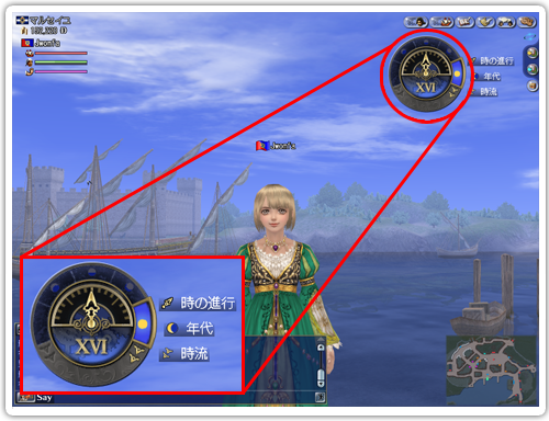 さらに、年代が動くことで、交易所の品揃えやNPCの持つレシピなど、世界の様々なものに影響が現れます。現在、どの年代にいるかは、コマンドでいつでも確認できます。