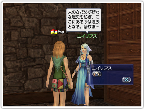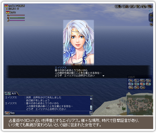 ワールドクロックの作動後、出航所に入ると“エイリアス”と名乗る女性が現れます。