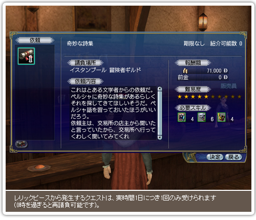 ※《ある詩の紙片》は、実施期間中、クエスト達成報告時や交易品購入時、洋上戦勝利時に獲得できることがあります。難度の高いものほど、入手できる確率が上がります。