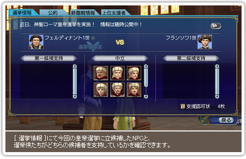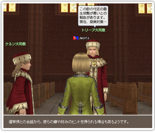皆さんの行動により皇帝選挙は進展し、その結果、1人の皇帝が選出されます。皇帝に即位した人物は様々な政策を実施しますが、その影響は近隣の西欧諸国を始め、世界中の諸地域、そして皆さんにも及びます。