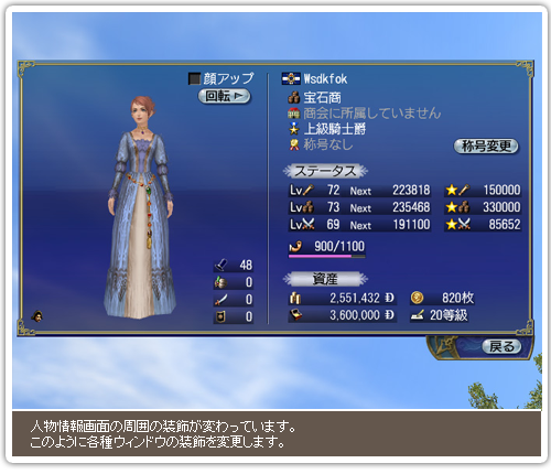 チャット画面やメニュー画面の装飾を変更すると共に、メインメニューのコマンド内容を変更します。