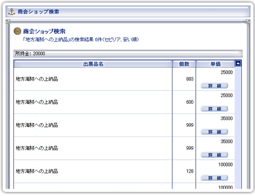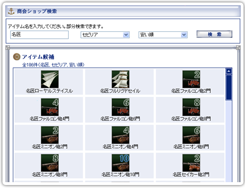 アイテム名から商会ショップの出展品を検索できます。