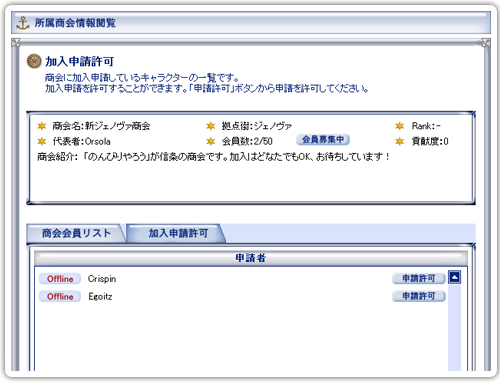 所属する商会の情報を確認できます。また、商会の代表と副代表は、「@Web」上から商会の加入申請を許可できるようになります。