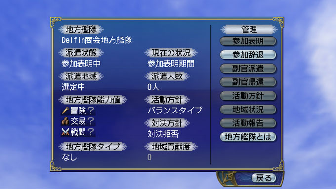 地方艦隊は各商会員から提供された副官たちで結成して派遣します。地方艦隊を派遣することで商会員の副官たちが成長し、派遣先で得られた利益は“地域貢献度”として商会管理局に蓄積されます。