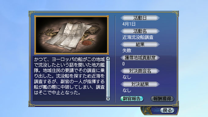 地方艦隊は派遣先で冒険や交易、海事を初め、地域交流や周辺調査など、様々な活動を行います。その成否によって“地域貢献度”を獲得できます。