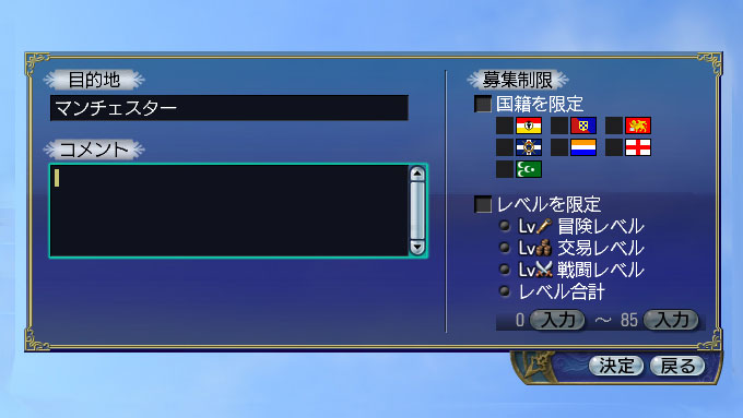 艦隊メンバーを募集する組合員は、[ メンバー募集 ]コマンドにて目的地や内容、制限事項などを設定します。するとその情報が艦隊募集掲示板に掲載され、他の組合員が閲覧できるようになります。