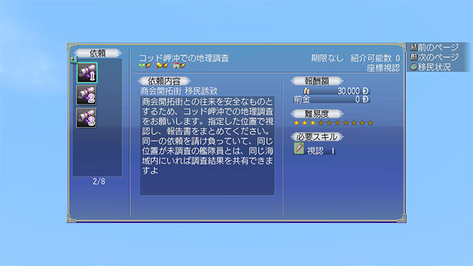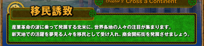 Chapter 2では新たに移民誘致クエスト(依頼)が請けられるようになり、それらを遂行することで、商会開拓街に移民を誘致できます。