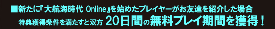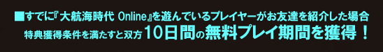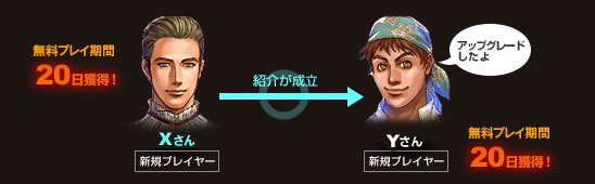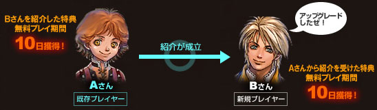 キャンペーン期間中に、新規プレイヤーをご紹介くださった方、また、ご紹介を受けて新規にプレイを開始された方の双方に、無料プレイ期間が贈呈されるキャンペーンです。