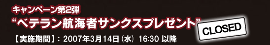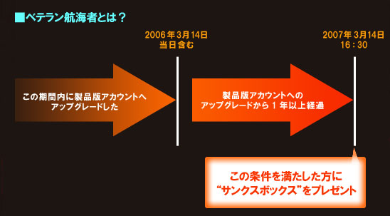 2007年3月14日(水)の時点で、製品版アカウントへのアップグレードから1年以上経過している方を対象に、もれなくゲーム内アイテム“サンクスボックス”をプレゼントいたします。 “サンクスボックス”の中には、まさにベテランと呼ばれる航海者に相応しい逸品が入っておりますので、ご期待ください。
