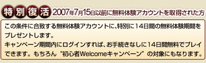 キャンペーン期間中に無料体験アカウントもしくはネットカフェアカウントから、製品版アカウントへアップグレードすれば、14日間のプレイ期間をプレゼント |
