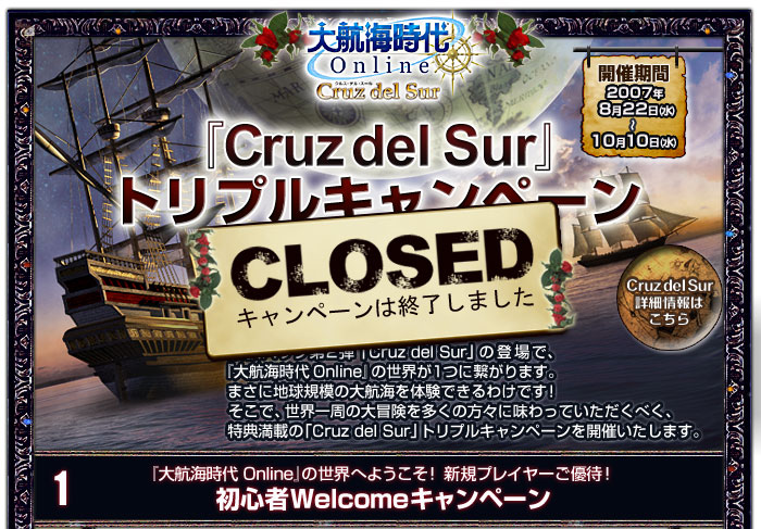 | 様々なご都合で、一時『大航海時代 Online』の世界から離れざるを得なかった方々を対象に、再び航海者として新拡張パック「Cruz del Sur」を体験できる復帰キャンペーンです。 |