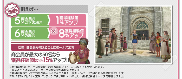 商会に所属しているプレイヤーキャラクター数によって、冒険、交易、戦闘、それぞれの獲得経験値に