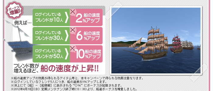 『大航海時代 Online』にログインしているフレンド数によって、船の速度にボーナスが加算されます。