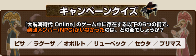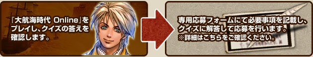 ※『大航海時代 Online』の有効なアカウント(体験版アカウント、製品版アカウント、ネットカフェアカウント)をお持ちの方は、ゲームにログインしてイベントNPCを探すことで、キャンペーンクイズの正解を見つけられます。 |