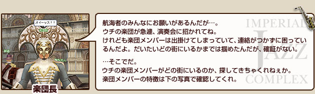 楽団メンバーは、5つの街に1人ずつ出現しています。見つけたら話し掛けてみてください。
