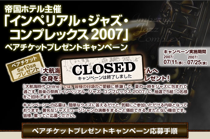 『大航海時代 Online』のプレイヤーの皆様から5組10名様を、帝国ホテル主催の「インペリアル・ジャズ・コンプレックス 2007」にご招待いたします。