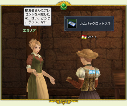 ゲームにログインしたら、西欧6ヶ国の本拠地の酒場にいるNPC“お手伝い娘”に話し掛けてみてください。イベントが発生し、アイテム《カムバックロット》を受け取れます。