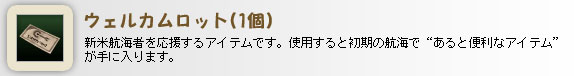 キャンペーン実施期間中に『大航海時代 Online』にログインし、『大航海時代 Online』を紹介してくれた方から受け取った“お友達様用”アイテムシリアルナンバーをゲーム中で登録してみましょう。すると、入門者に役立つアイテム《ウェルカムロット》が手に入ります。