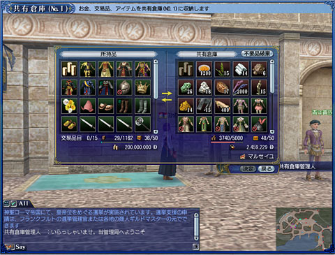 - 同一アカウントかつ同一ワールドの別のキャラクターで、NPC”共有倉庫管理人”のコマンド[共有倉庫]を選ぶと、先と同一の収納画面が表示されます。収納したいアイテムや、取り出したいアイテムを選んで[決定]すると“共有倉庫”の内容が更新されます