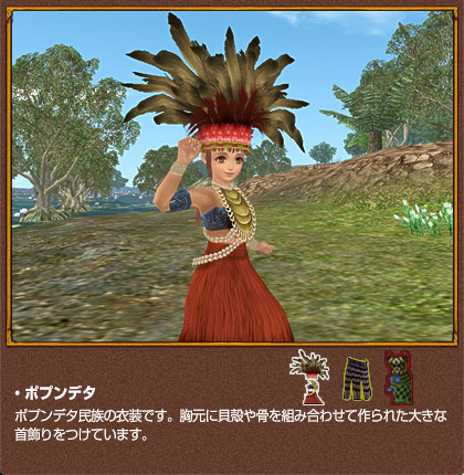 ワールドガイド第一回と第二回では、西欧調の新衣装をご紹介しましたが、新海域・南太平洋に住む人々が着用する衣装ももちろん登場します。 |